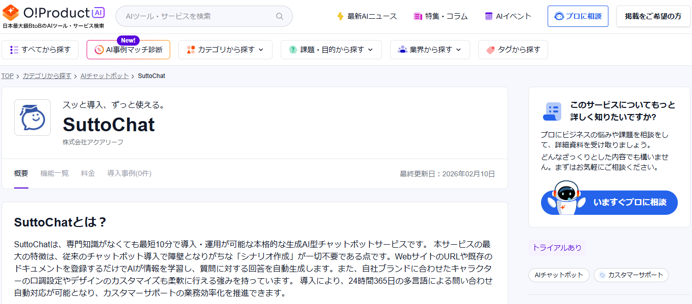 このたび、当社AIチャットボット「SuttoChat(スッとチャット)」が、ITツール・サービス検索サイト O!Product(オープロダクト) に掲載されました。