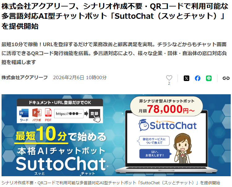 このたび、企業向けAIチャットボット「SuttoChat(スッとチャット)」のプレスリリースを、国内最大級のプレスリリース配信サービス「PR TIMES」にて配信いたしました。